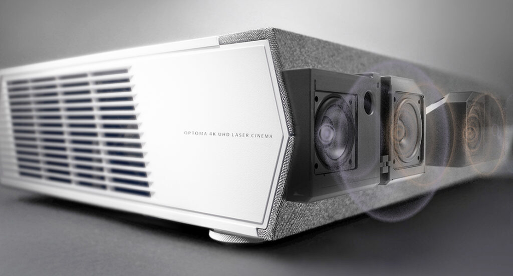 Máy chiếu 4K Optoma CinemaX P2 tích hợp một hệ thống loa soundbar Dolby Digital 2.0 với hai loa toàn dải, hai loa trầm công suất 38 watt cùng thiết kế cao cấp mang đến âm thanh ấn tượng với chi tiết sắc nét với độ rõ ràng vượt trội.