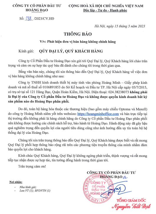 Do đó, toàn bộ hàng hóa thuộc các thương hiệu (bao gồm máy chiếu Optoma và Maxell) do công ty Hoàng Minh niêm yết trên website http://hoangminhoffice.com và bán trực tiếp tại thị trường đều không phải là hàng chình hãng do Công ty Cổ Phần Đầu tư Hoàng Đạo phân phối nên không được hưởng các chính sách hỗ trợ, bảo hành từ Hoàng Đạo. Hành động này đã gây hậu quả nghiêm trọng đến quyền lợi của người tiêu dùng cũng như ảnh hưởng đến uy tín toàn bộ hệ thống đại lý của Công ty Cổ Phần Đầu tư Hoàng Đạo.