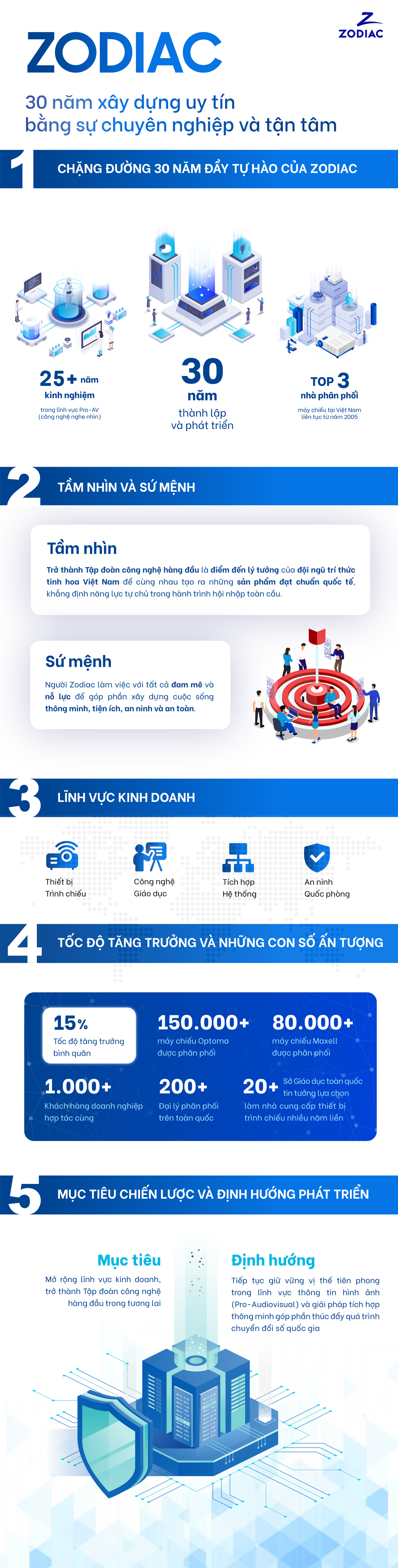 Với 30 năm phát triển gắn liền với công nghệ, đặc biệt là lĩnh vực thông tin hình ảnh, Zodiac luôn là lựa chọn uy tín hàng đầu chuyên cung cấp thiết bị trình chiếu, tư vấn và triển khai các giải pháp tích hợp nghe nhìn thông minh ứng dụng đa lĩnh vực.